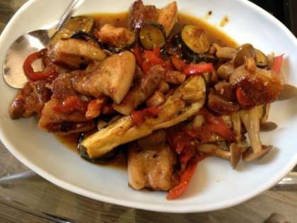 これはちょっとだけ辛くしたトマトベースの豚バラ、パプリカ、茄子、とズッキニの煮物。