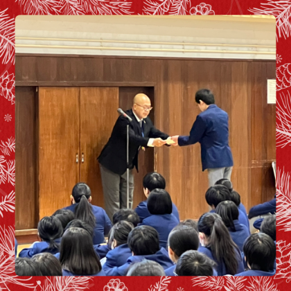 まずはじめに、2学期に行った赤い羽根募金や、冬季休業中の部活動(卓球部・ソフトボール部)の賞状伝達が行われました。