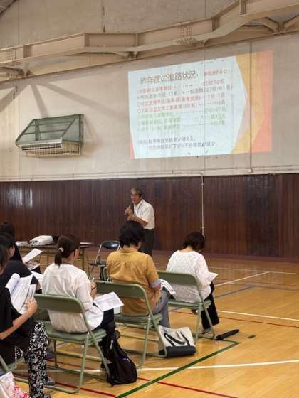 昨年度の進路の状況、今年度の進路日程、公立高校・私立高校の特色、その他の進学先について、授業料無償化制度、奨学金制度について、と盛りだくさんな内容でした。たくさんの保護者が出席してくださいました。お子様と一緒に、次なるステージに向かって、共に歩みはじめる一助となれば幸いです。
