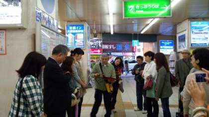 (写真左:弁天町でガイドさんから説明を受けています)