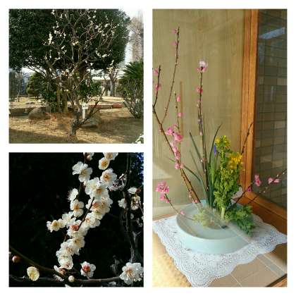 今日の写真は玄関前に咲いた梅と花台の中にある菜の花と桃、アイリスの活け花です。