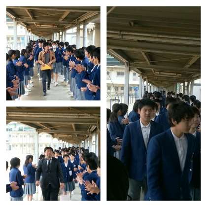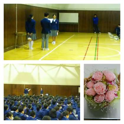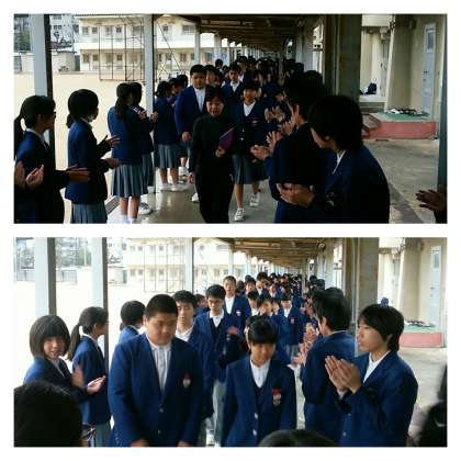今日は体育館で生徒会主催のお別れ会が実施され、3年生に12年の代表生徒からお別れと感謝の言葉が贈られました。その後、2年生が中心となって作られたピンクのコサージュも贈られました。最後は、渡り廊下に作られた花道を3年生が通り、大きな拍手が鳴る中、在校生との最後の交流をしました。