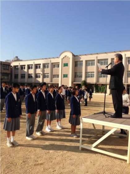 晴れわたった今朝、全校集会で、後期生徒会本部役員認証式が行われました。緊張した中、認証状が校長先生から授与されました。