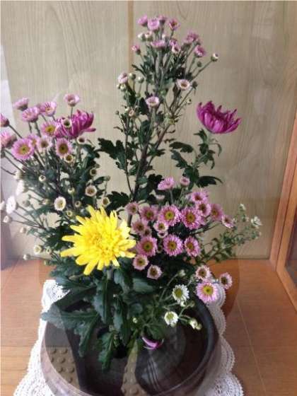 毎週火曜日、仁平八千代さんに「生け花」を飾っていただています。上の写真は1週間経った、「菊」です。まだ、きれいに花が咲いているので、校長室の前に飾っています。
