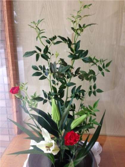 本日飾っていただいたのは「素馨(そけい)」です(下の写真)。後ろ側にあるのが、「素馨(そけい)」で、前に「ゆり」と「カーネーション」が飾ってあります。ちなみに、そけいの花言葉は、「素直」、「無邪気」だそうです。
