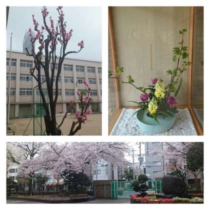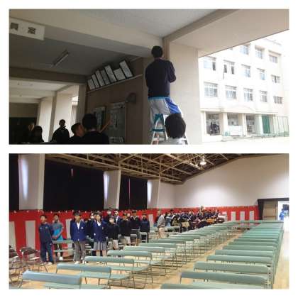 生徒会の生徒や昨年度の学級代表、部活動の生徒たちが校内清掃活動や、式場準備と新入生のために一生懸命頑張って働いてくれました。また、清掃活動後には講堂で明日の入学式で披露する校歌を吹奏楽部と式参加生徒が練習しました。玄関前には、新入生のためのお花も活けて頂き、新入生を迎える準備は万端です。
