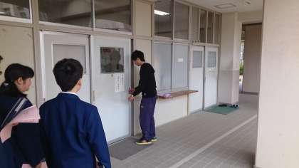 写真は、岡崎先生が、一年一組に職員室への入室の仕方を教えているところでした。