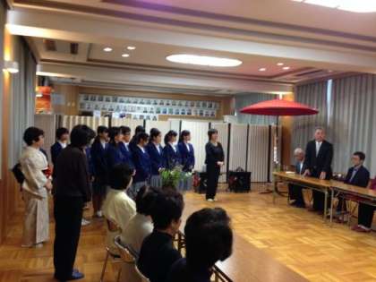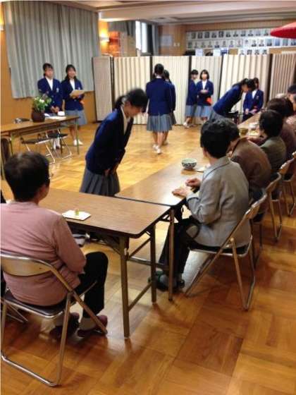 毎年、本校の茶道部が参加しお世話をさせていただいています。顧問も部員生徒も地域の方々と交流できることを大変うれしく思っています。生徒たちは緊張しながも、お茶のいただき方を丁寧に説明するなど、おもてなしの心でお点前を披露していました。