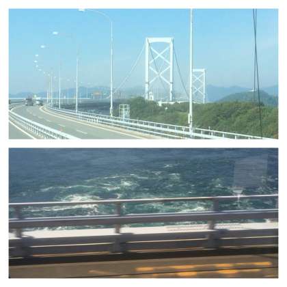 写真は、鳴門大橋と鳴門大橋下の渦潮、入村式の様子です。
