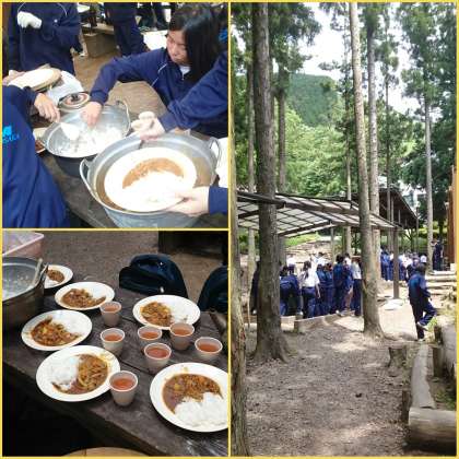 肉の食材をカラスに取られたり、薪に火がなかなかつかず煙に巻かれり、ご飯が少し水分過多状態になったり、カレーというよりはカレースープになってしまうなど、様々なアクシデントに見舞われましたが、各班最高の一皿を協力して作り上げてくれましまた。