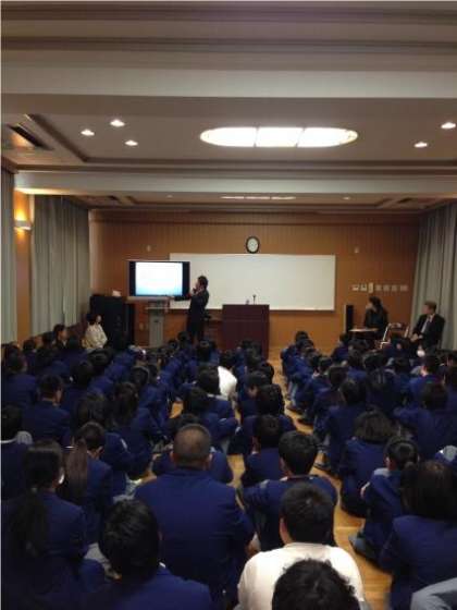 本日6時間目、1年生全員を多目的室に集め、「歯・口の健康教室(1年生)」を実施しました。講師として本校歯科校医井村先生、松浦診療所歯科医山西先生に来ていただきました。