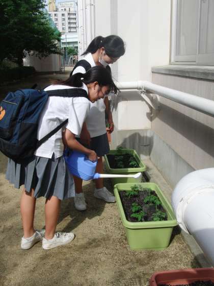先日、授業でクラスの班ごとに苗を植え、毎日の水やり当番を決めました。生徒たちは「今日は雨降るかなぁ。」と普段以上に天気予報をチェックしながら水やりの量を調節しています。廊下を歩く時にもさりげなく苗をチェックしている優しい生徒たちの姿に植物を大切にする心が垣間見られました。