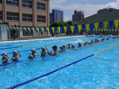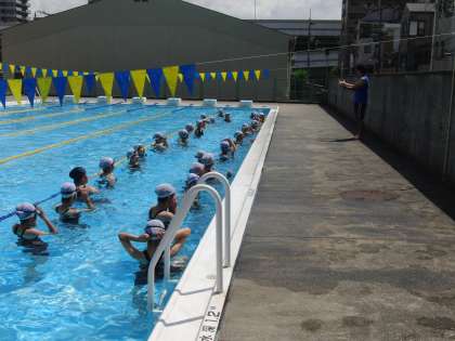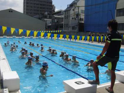 7月に入り市岡中学校のプールには生徒たちの元気な声が響きわたっています。今日は蒸し暑く生徒たちにとっても水泳は気持ちがよかったようで、のびのびと体を動かしていました。