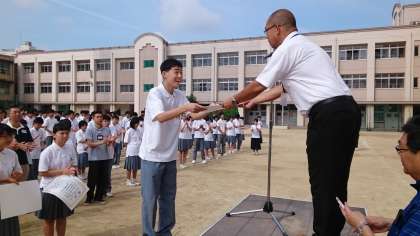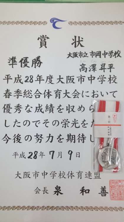 先週の7月9日(土)放出中学校体育館において、大阪市中学校卓球個人選手権大会が開催されました。この日行われたのは、7月2日の予選1日目を勝ち抜いた16名の選手達で、本校からは2年生の高澤君が勝ち上がっていました。初戦相手に2セットのリードを許す展開となったものの、持ち前の強心臓と集中力の高さを発揮し、粘り強く戦い逆転で勝利をおさめ波に乗ると、続く準々決勝、準決勝と勝ち進み念願の決勝に駒を進めました。決勝では1セット目を取るものの、3セットを連取され逆転負けを喫し、惜しくも優勝を逃しました。しかし、堂々の大阪市第2位とり、見事大阪府大会出場を決めてくれました。今回の雪辱を大阪府大会で果たしてほしいと思います。
