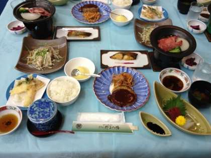 修学旅行1日目の夕方、長良川でのラフティングのあとは、温泉に入って夕食を食べました。