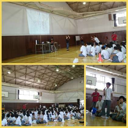 今日は34時間目の時間帯に、演劇観賞事前ワークショップが体育館で行われました。このワークショップには、11月に演劇を披露してくださる劇団道化の俳優の方々にお越しいただき、演技のポイントや心構え、実際の舞台の雰囲気などについて教えて頂けきました。