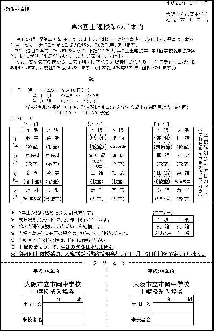 また土曜授業参観後には、来年度校区外から市岡中学校を希望・検討されている皆様への保護者説明会を行います。