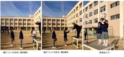 本日の全校集会で、校長先生から「税についての作文」受賞者の賞状授与と人権に関してのお話がありました。