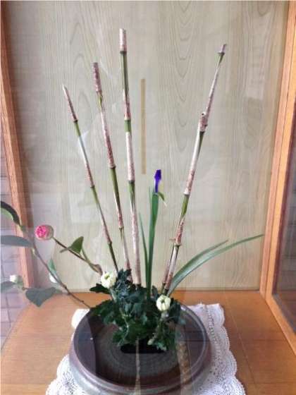 今週の活け花は「イリス・たけ・椿・菊」です。