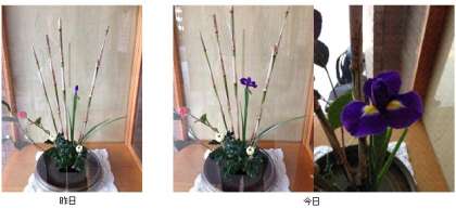 昨日、紹介した活け花の「イリス・たけ・椿・菊」ですが、イリスが見事に1日で咲き始めました。