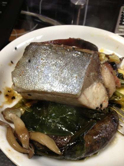 鰤です。(鰤は英語ではなんと言うか分かりませんが。。。)白出汁、塩とほんの少しのバターでぶなシメジ、茄子、とほうれん草をホイル焼きで作りました!もうほんまにうまかった!魚の焼き具合といい、完璧な仕上がりやった!