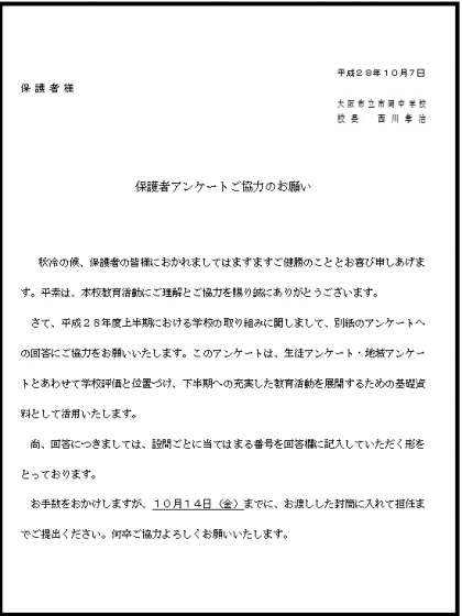 昨日10月7日(金)、全生徒に学校評価 保護者アンケート(1)を配布させて頂きました。