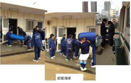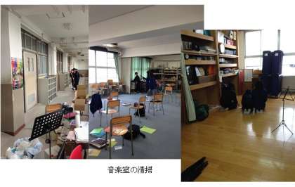 ラグビー部は、部室の掃除。(写真上)吹奏楽部は、音楽室はじめ練習に使った特別教室など、きれいにしています。(写真下)