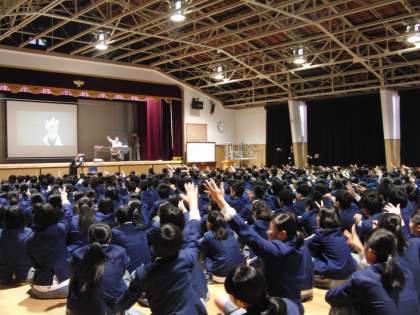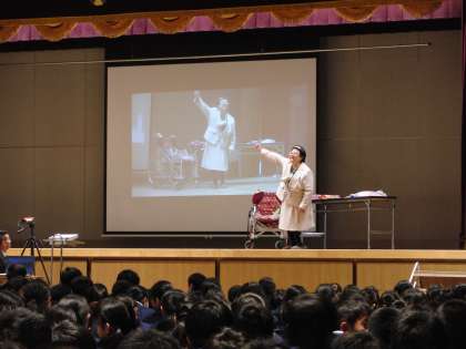 本日の土曜授業では和歌山県御坊市より柳岡克子(やなおかよしこ)さんをお迎えして人権講話をしていただきました。柳岡さんは生まれながらに身体に障がいがあり、その人生の歩みを「車いすの元気配達人」として各地でご講演されている方です。生徒達は最初は緊張した面持ちでしたが、柳岡さんの明るい語り口調に一気に引き込まれ、場内は笑いが絶えませんでした。生徒からは「お話を聞いた後、なんでも最後まであきらめずに頑張ろうと思えた」「卓球で金メダルを取ったなんてすごい!」「ぼくはどこも不自由じゃないけどダメなところがいくつかあります。でも、柳岡さんの話を聞き、頑張ろうという意識が強まりました。とても楽しかったです」「今日は家にかえったらお母さん、いつもありがとうと伝えたいです」など多くの感動メッセージが寄せられました。