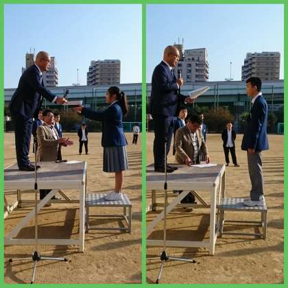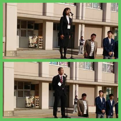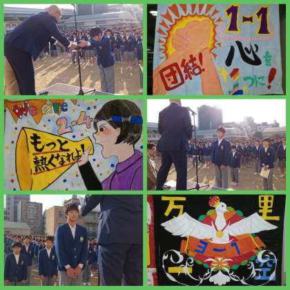 続けて、文化祭の時に投票を行った学級応援旗の優秀クラスが発表されました。1年1組、2年4組、3年1組が見事優秀賞を獲得しました。おめでとうございました。