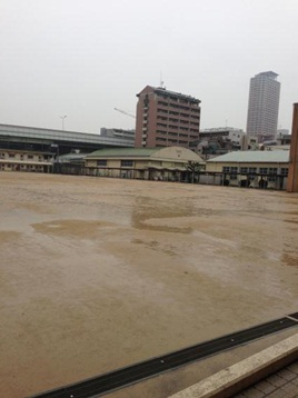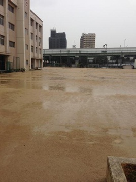 3年生は実力テスト1日目で、3時間で下校。写真のようなグランド状態なので、ラグビー部、野球部、ソフトボール部は室内でのトレーニングやミーティングをしており、比較的静かな学校の様子です。