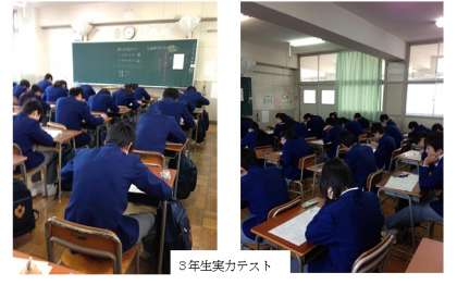 3年生は実力テスト2日目で、理科と社会です。(写真上)当然ですが、みんな集中して取り組んでいます。