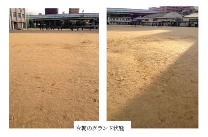 昨日1日中降った雨ですが、今朝は今のところ止んでいます。本校の施設の自慢の一つ、グランドの水はけがすごく良いことです。(写真下)日ごろから、体育科の先生が丁寧に手入れをしていることや、活動しているクラブ部員の手入れがしっかりできていることも考えられます。感謝です!
