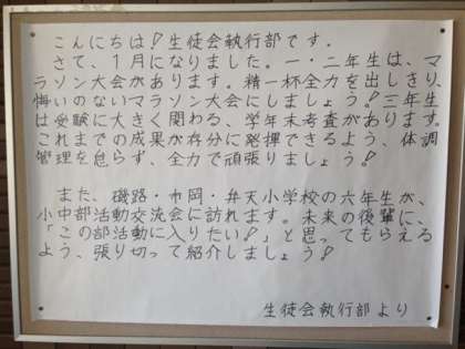 今日と月曜日、校区小学校との交流で、部活動交流会が行われます。今日は磯路小学校と市岡小学校で、弁天小学校は月曜日に来ます。
