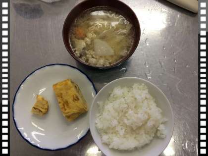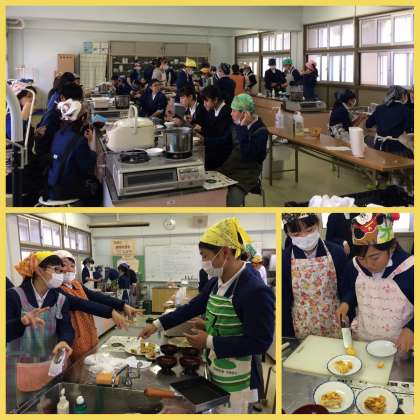 2年生では家庭科の授業で調理実習が行われています。豚汁と卵焼きとご飯という和食の定食に挑みました。卵焼きは返すのが難しく多くの班で濃いめの焦げ目が付いてましたが味は抜群でした。