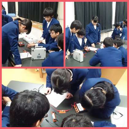 今回は電流と電圧の分野で、大熊先生からの説明後に回路を班毎に作って、理論値を実験で確認する実験を行っていました。