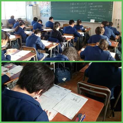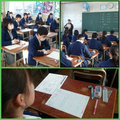 今日1・2年生は、大阪府チャレンジテストが実施され、1年生は国語、英語、数学の3教科、2年生は国語、社会、数学、理科、英語の5教科が実施されました。高校入試にも関係する大切なテストとあって、いつも以上に真剣な眼差しでテストに取り組んでいました。