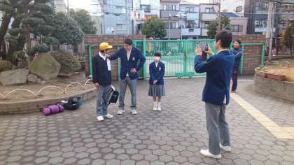 生徒会は、今度中学校下の3小学校(磯路、弁天、市岡)に出向き、各小学校の6年生に中学校紹介を行います。今日は、その時に使うビデオ撮影を放課後正門前で行っていました。どんな内容に仕上がるか楽しみです。