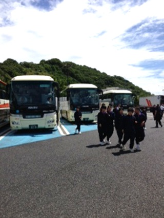 (写真)バスから降りる生徒達/SAからの光景