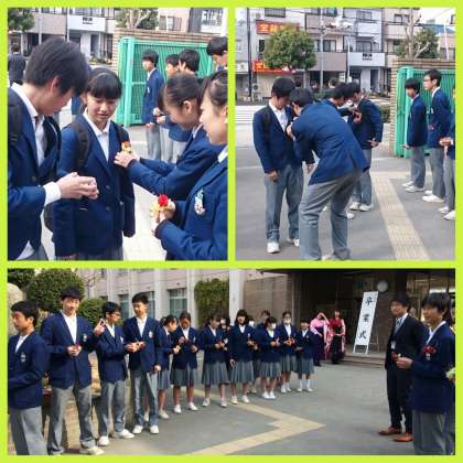 9時頃に登校してきた卒業生を在校生が出迎え、一人ひとりに手作りのコサージュを胸に付けてもらっていました。