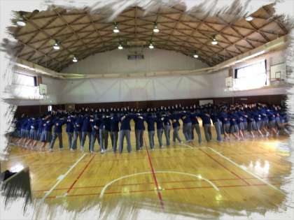 10時の開式直前、卒業生の集合場所であった体育館では、70期生の中学校での最後の取組となる卒業式の成功を祈念して、3年生全員で円陣を組み気合いを入れてから式場に向かいました。