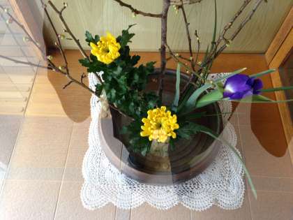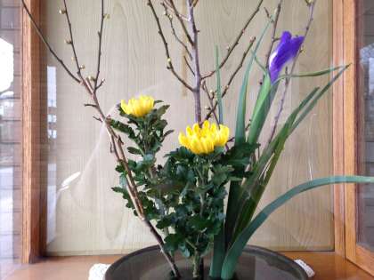 今日の花は、「梅」「菊」「イリス」です。前回生けていただいた「梅」は、ピンク色でした。今回の「梅」は、つぼみを見ると白色のようです。今日は、寒さが厳しいので、この寒さが和らいだ時には次々と花を咲かせてくれることでしょう。とても楽しみです。