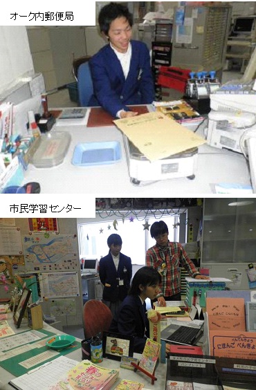 オーク内郵便局:カウンターの中で郵便業務(切手や印紙を扱う)を中心に体験しました。局員の方からは「とてもしっかりされていて感心しています」とほめていただきました。