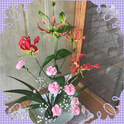 今週も玄関に素敵なお花を活けていただいています。今週は、『グロリオーサ』・『カーネーション』・『カスミ草』・『シャガ』となっています。学校にお越しの際はぜひご覧ください!
