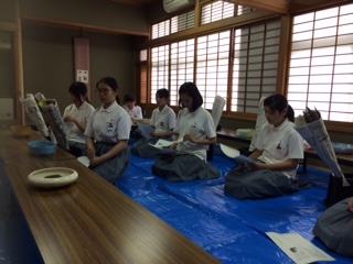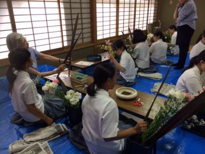華道部では毎月、季節のお花を花器に剣山を使って生けています。今年度、新たに4名の1年生を迎え、合計15名で活動しています。活動日には指導員として松村先生と平岡先生にお越しいただき、専門的な知識も数多く教えて頂いています。