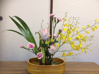 今月は春らしい明るい色のお花を生けました。今回のお稽古ではまず初めに基本的な生け花の話を講義して頂きました。