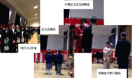 「蛍の光」斉唱。記念品贈呈。保護者代表謝辞。