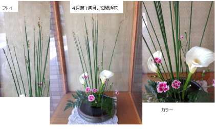 また、昨日、仁平さんが今年度もボランティアで玄関に花をかざっていただきました。4月第1週の生花は、「フトイ」「カラー」「カーネーション」です。「フトイ」「カラー」は聞きなれていないので、調べてみました。