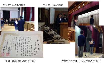 (写真下の左:表彰状授与、校長先生から生徒会会長大智さんへ。右:進行は大智さんと松浦さん、在校生代表は3年生浮田君、新入生代表は河野君です。)