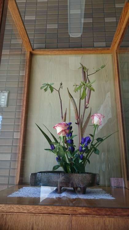 今週のお花も美しいです。 オクラ・バラ・リンドウ・シャガ です。 ありがとうございます。