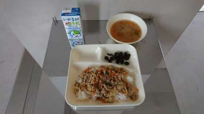 今日のメニューは、他人丼・みそ汁 黒豆の煮もの、ごはん、牛乳 です。 いただきます。